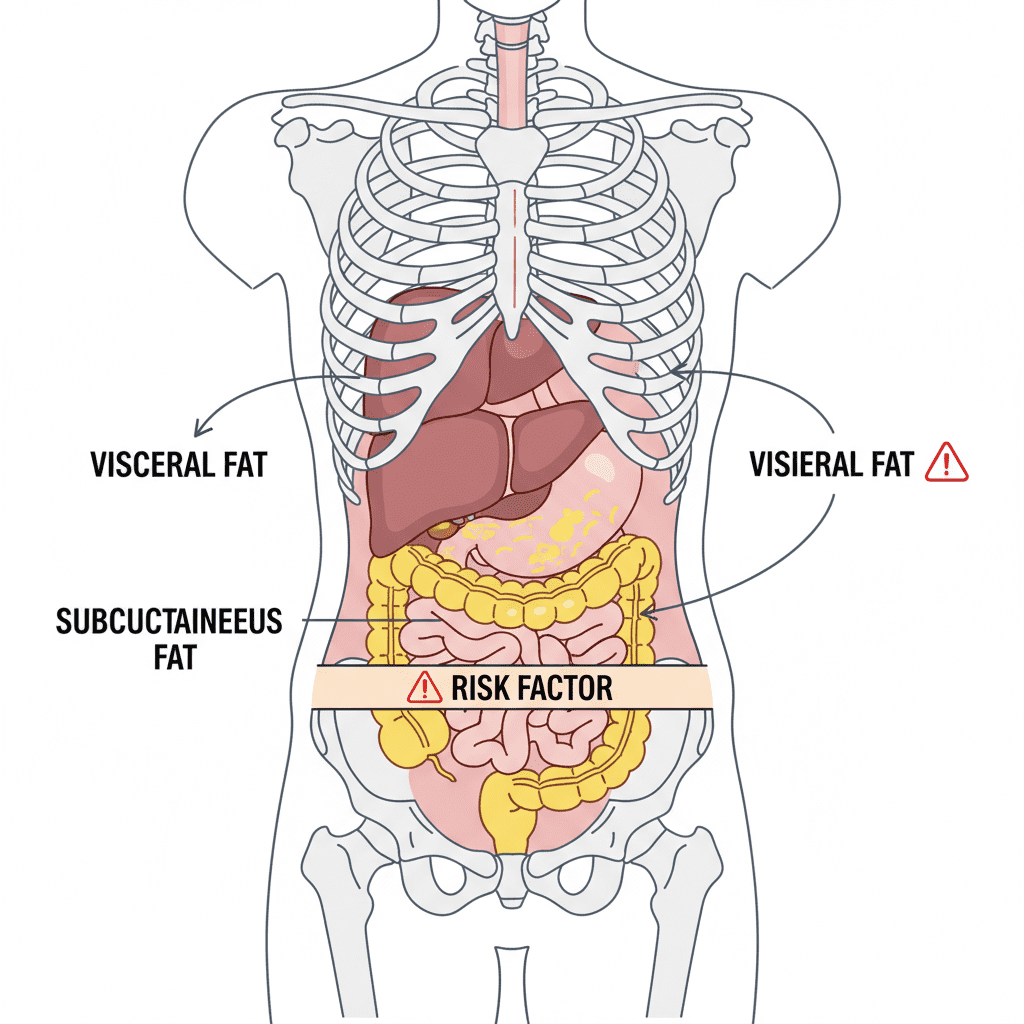 人體圖示:區分說明內臟脂肪(器官周圍)與皮下脂肪(皮膚下方)的具體位置,警示標誌突顯內臟脂肪對健康的潛在威脅。